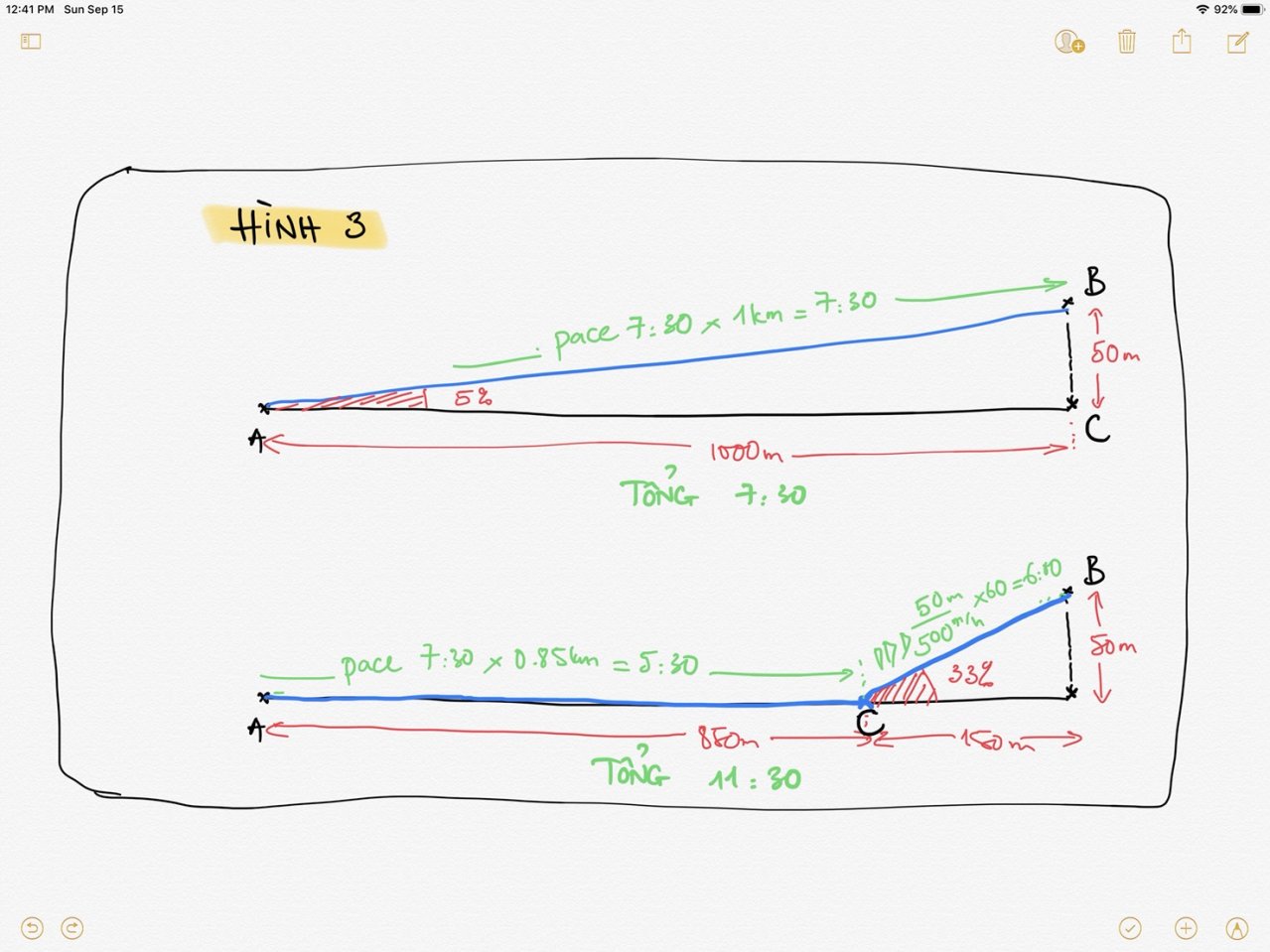 Con dốc 2: 150m leo dốc 33% (50m elevation gain) tôi sẽ lấy tốc độ leo trung bình ở núi Bà Đen làm chuẩn, tức là tính ra tôi sẽ mất 50/500×60=6:00 để leo hết 50m. Còn 850m đường bằng, với pace trung bình khoảng 6:30 tôi mất thêm tầm 5:30. Vậy trong trường hợp này tôi cần tới 11:30 để đi hết con dốc số 2 (xem hình 3)